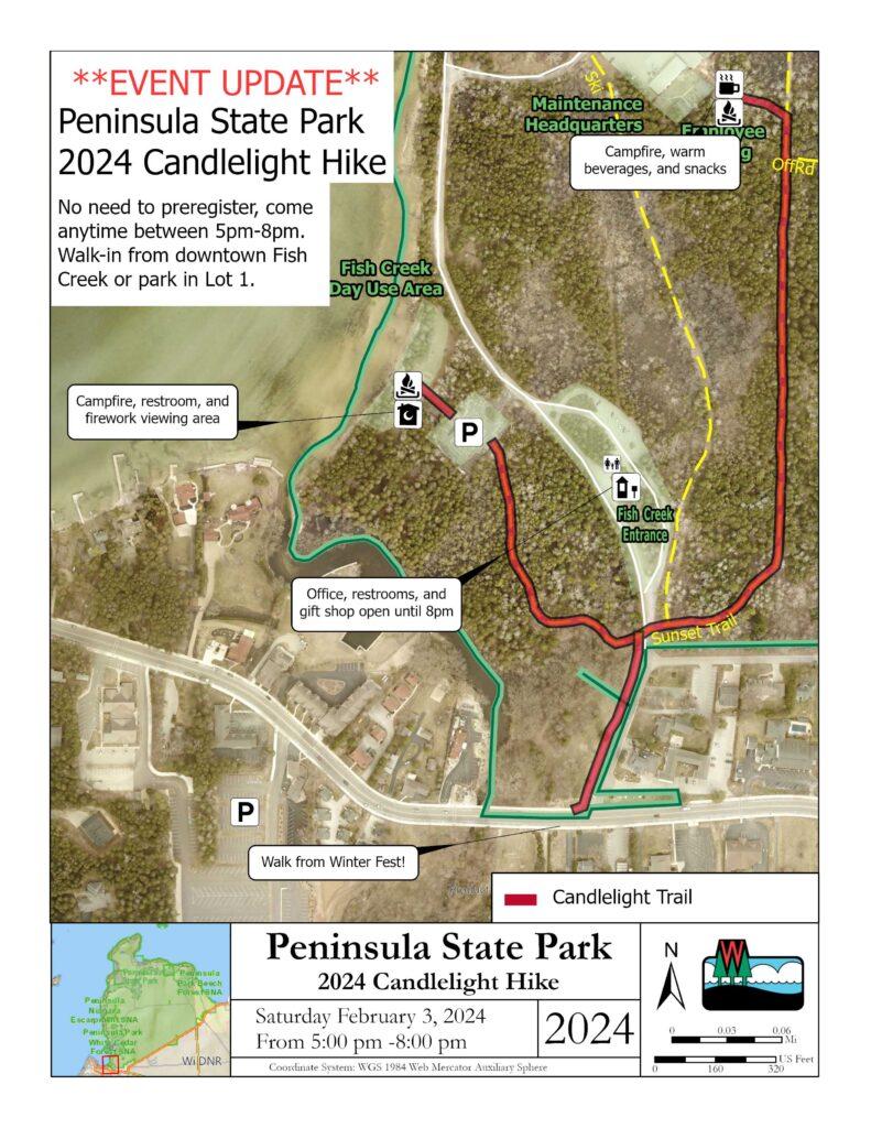 Please see the above graphic for changes to the candlelight hike/ski on Saturday, February 3rd. Due to conditions in Lot 5 and the ski trails, the ski portion of the event will be cancelled. However, we will still have the hike portion at a different location!